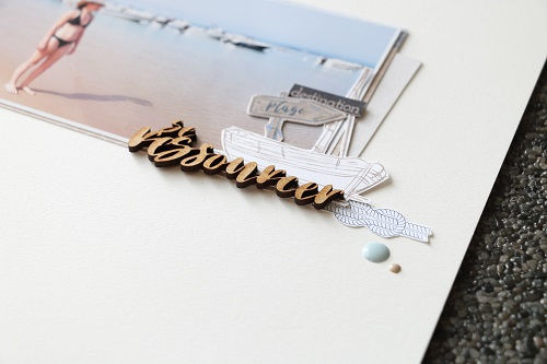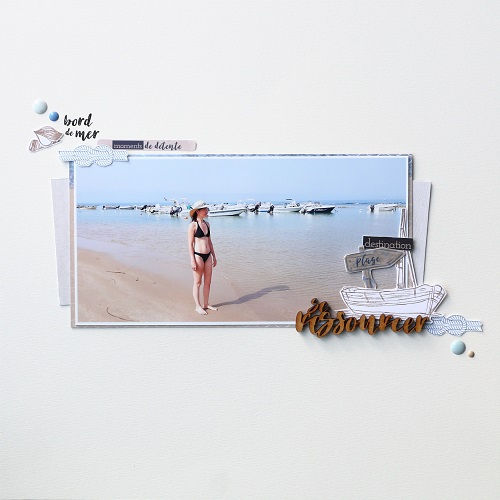 J'ai utilisé également le tag beige avec les deux nœuds de cordes présent sur le papier "souvenir de vacances". Je l'ai découpé en deux, dans le sens de la largeur et disposé de part et d'autre de la photo. Les deux nœuds de cordes ont été détourés et utilisés pour la décoration.